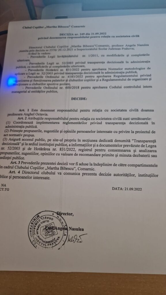 • Numele și prenumele persoană responsabilă pentru Legea 544/2001: ANGHEL OCTAVIA